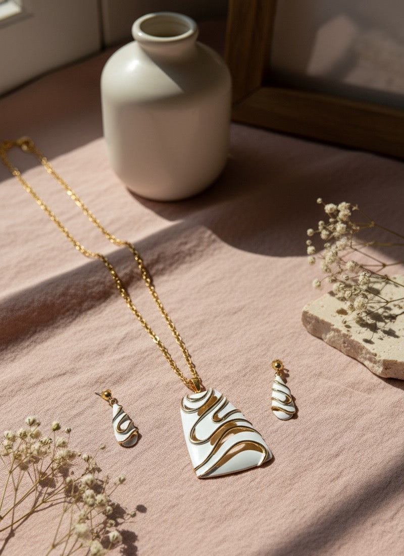 • Matching earrings: Echoing the pendant’s shape and design, the earrings are sleek and slightly tapered, with the same white enamel and gold swirl detailing. Their fluid form gives a harmonious and elegant touch to the overall set.